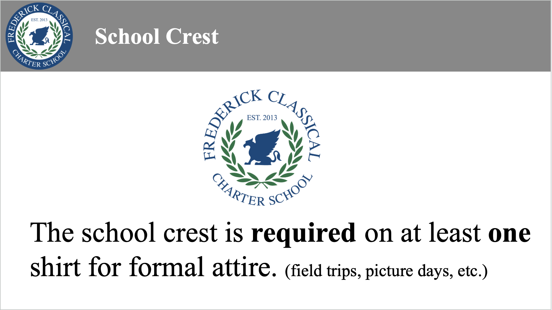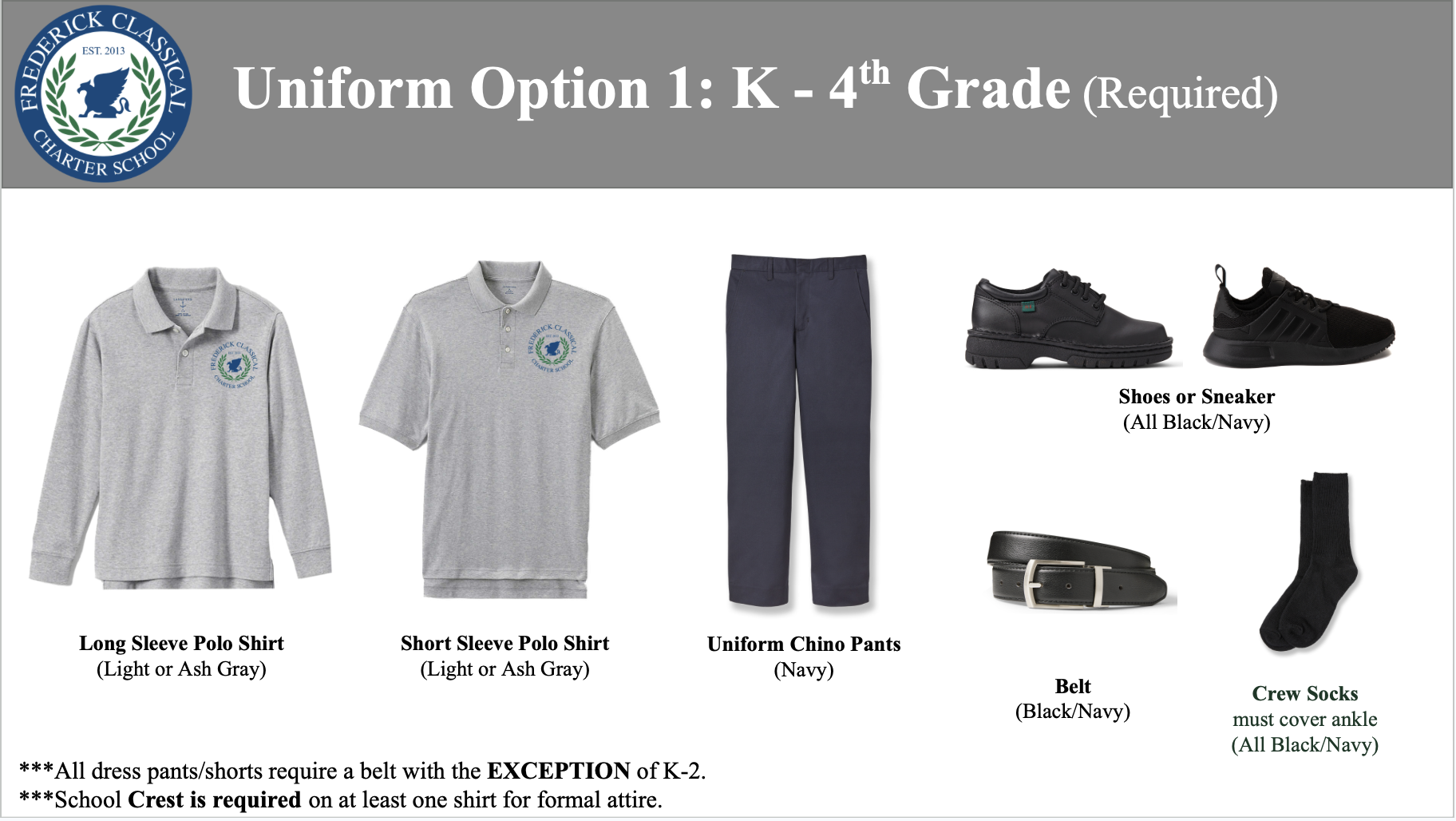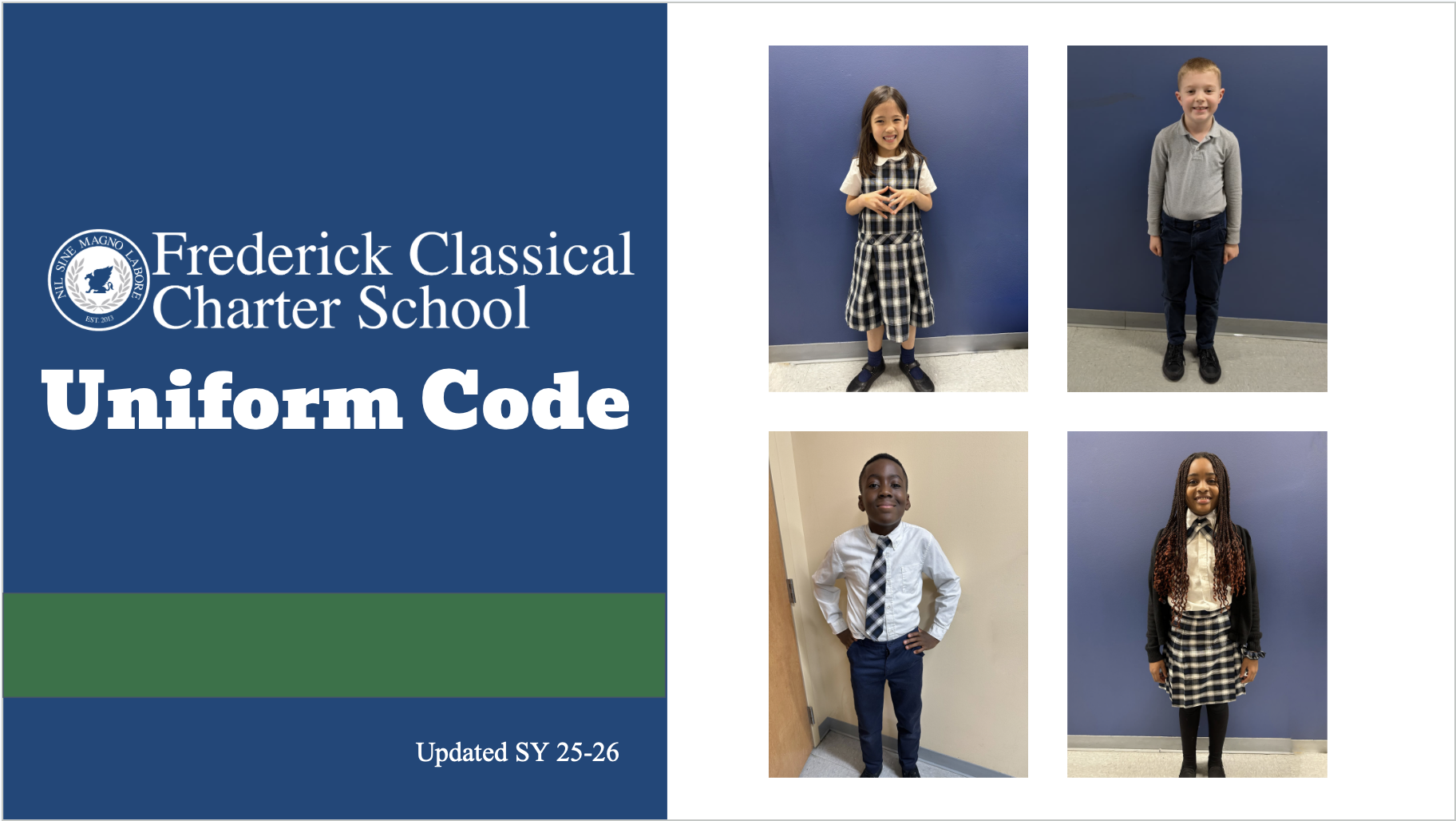 Please familiarize yourself with the school dress code. The uniform is manditory for all scholars at Frederick Classical Charter School