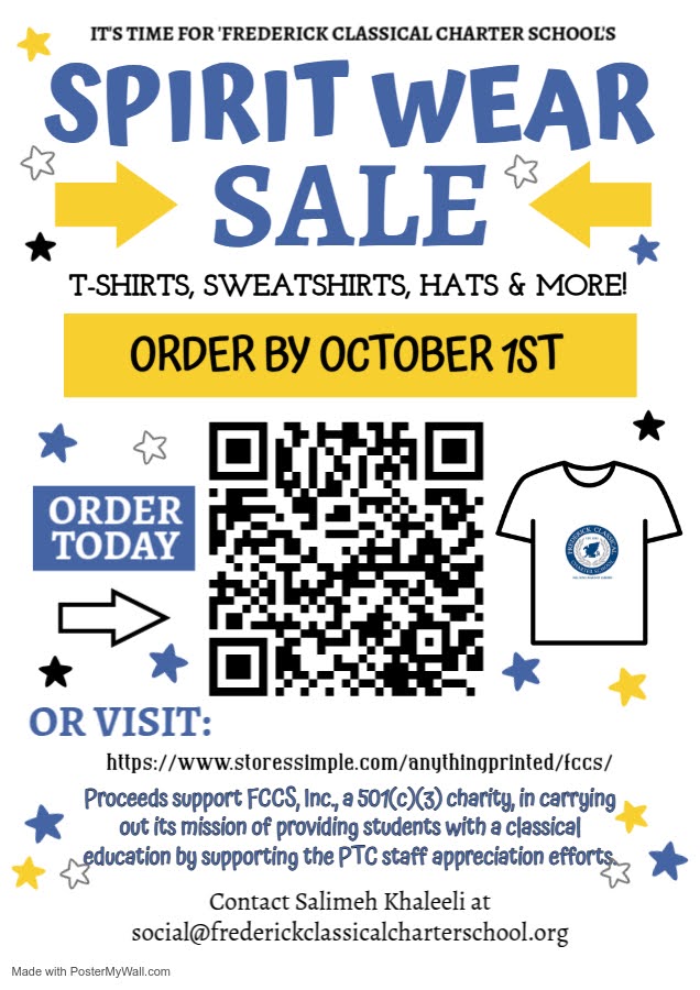 It’s time to rock your colors! Our Spirit Wear Sale is ON—think comfy hoodies, cool tees, and all the gear to show off your school pride. Hurry—Sale Ends: OCTOBER 1ST Limited stock, unlimited spirit! Let’s turn our GRIFFIN pride all the way up! Contact social@frederickclassicalcharterschool.org with questions |