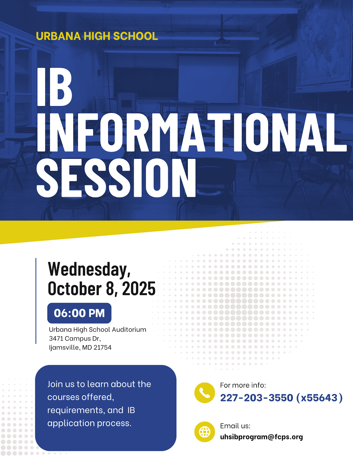 Students and families interested in the International Baccalaureate Program at Urbana High School are invited to attend an information session on Wednesday, September 24th at 6:00 pm in the Urbana High Auditorium (3471 Campus Drive, Ijamsville). At this meeting, we will share information about the program- prerequisites, courses, and requirements for earning the IB Diploma- and the application process. A second meeting will be held on Wednesday, October 8th at 6:00 pm at the same location for families unable to attend the first meeting.