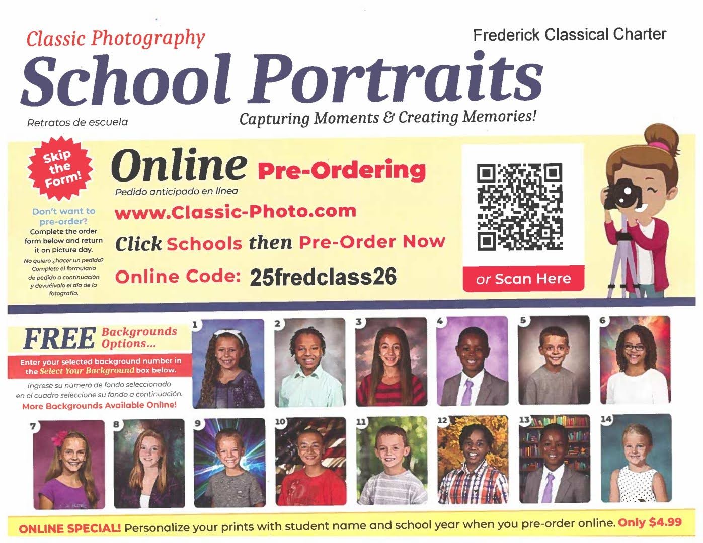 Get ready for Picture Day at Frederick Classical Charter School! This is a wonderful opportunity to capture your scholar’s smile and create lasting memories. Individual photos will be taken for yearbook use and family purchase. To order, visit www.classic-photo.com |