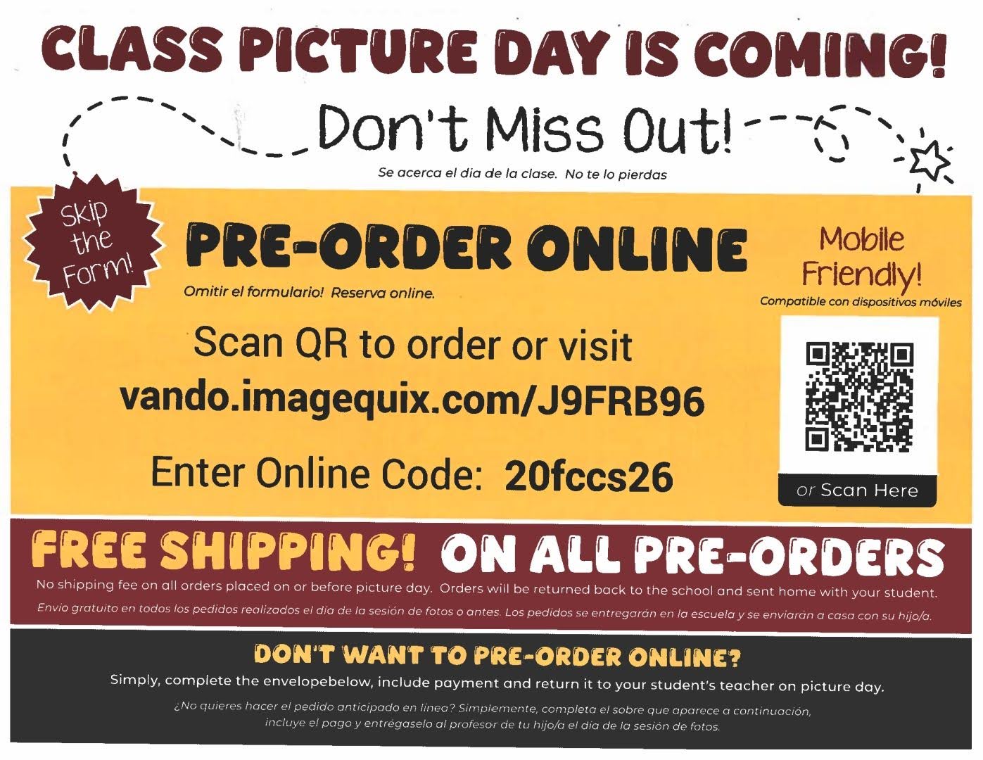 Class picture day is right around the corner! Families may pre-order photos online using the QR code or website provided. Online ordering is quick, mobile-friendly, and includes free shipping on all pre-orders. Paper order envelopes will also be accepted on picture day. |