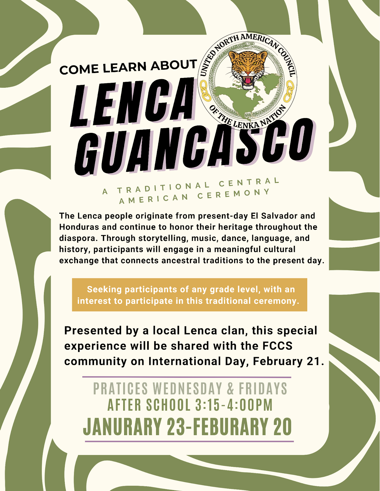 Frederick Classical Charter School is honored to host a Lenca Guancasco, a traditional Indigenous ceremony from Central America that celebrates Peace, Unity, and Community. Presented by a local Lenca clan on International Day, February 21. Frederick Classical Charter School is honored to host a Lenca Guancasco, a traditional Indigenous ceremony from Central America that celebrates Peace, Unity, and Community.