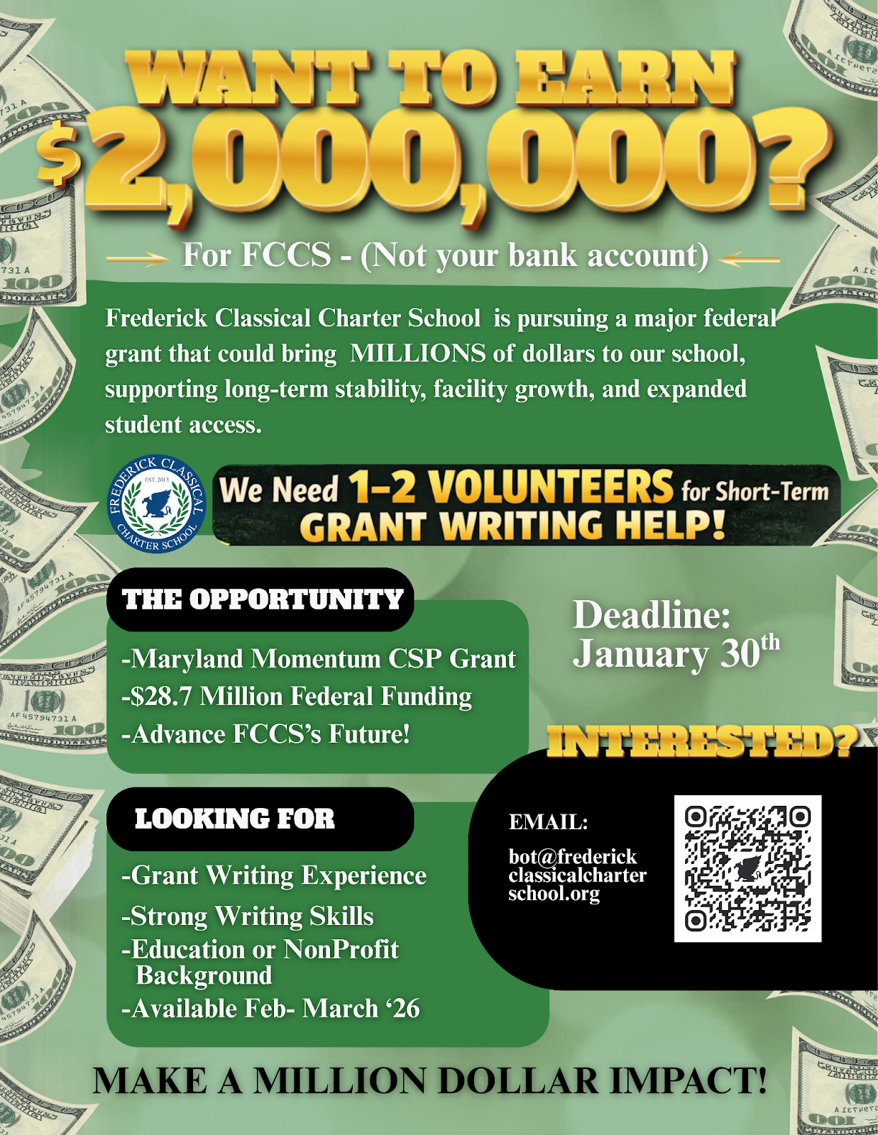 FCCS has an exciting opportunity to pursue federal funding that could bring up to $2 MILLION to our school! We are looking for 1–2 volunteers to support grant writing efforts during this critical window. Your expertise could help shape FCCS’s future. |