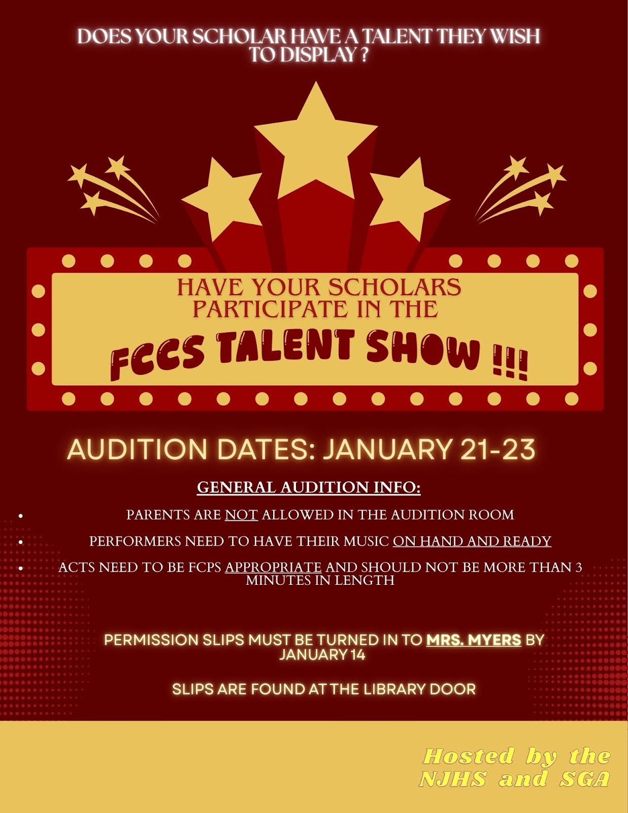 Auditions will be held: 01/21-01/23 after school at FCCS for those who turned in their permission slips. |