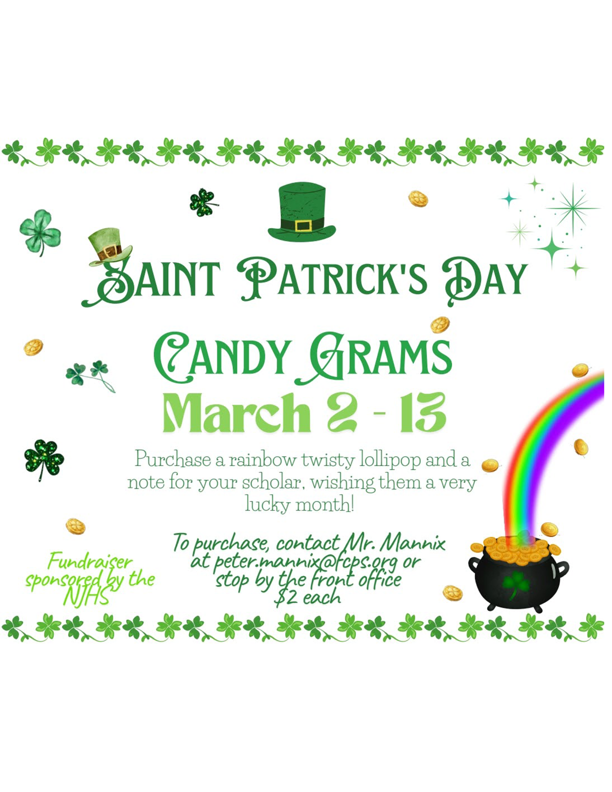 Purchase a rainbow twisty lollipop and a note for your scholar. wishing them a very lucky month. To purchase contact Mr. Mannix below or stop by the front office. Fundraiser sponsored by NJHS |