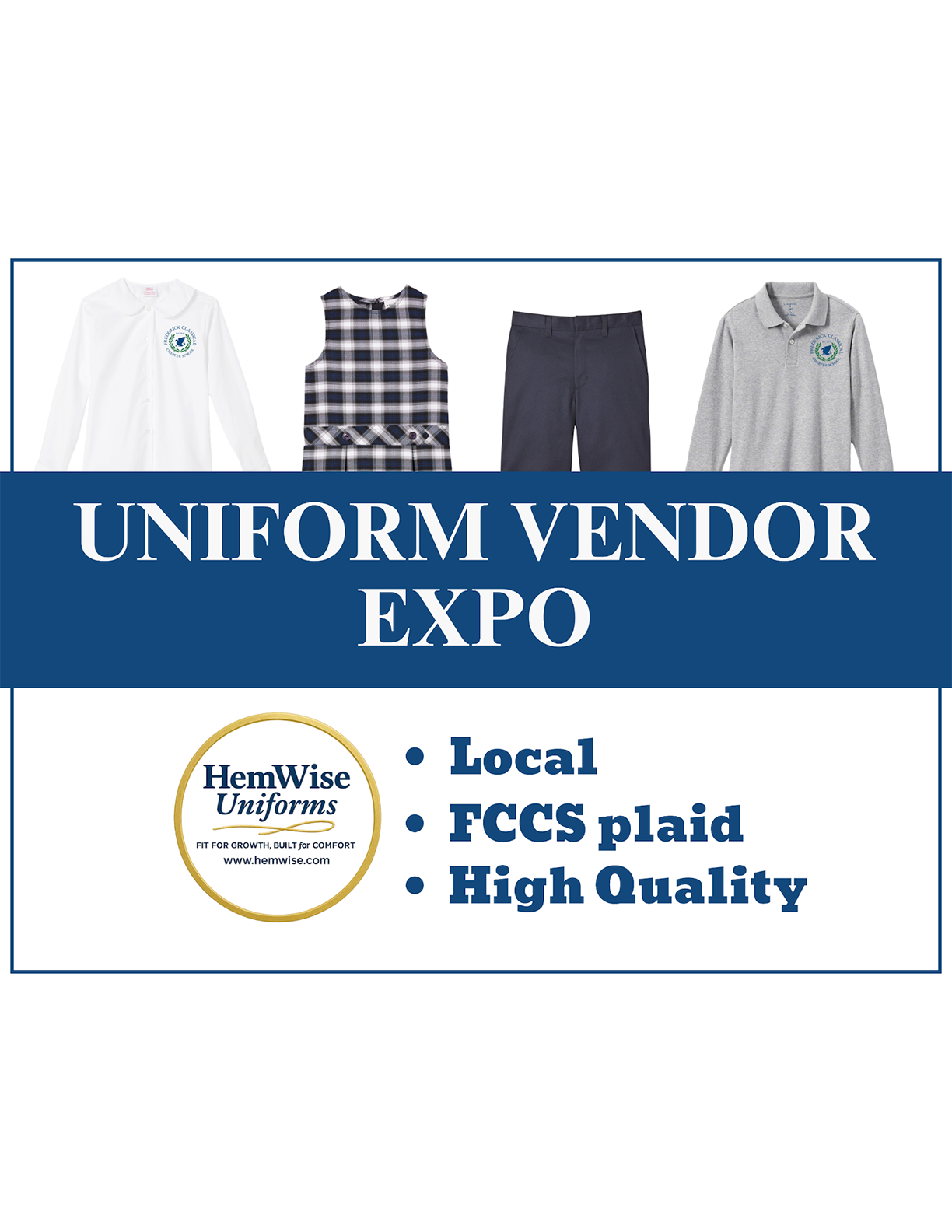 We’re exploring a potential new uniform vendor—Hemwise, a local company that carries our plaid fabric. Stop by the front office lobby now through March 20 to see sample items and check out the quality and product options. Have feedback? Email us below or share your thoughts with Ms. Tucker or Ms. Partlow in the front office. |